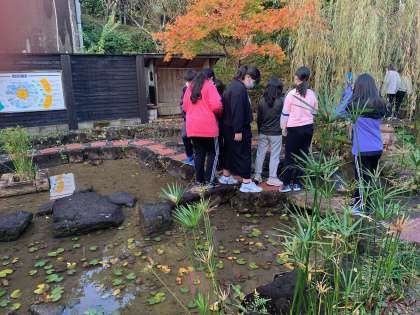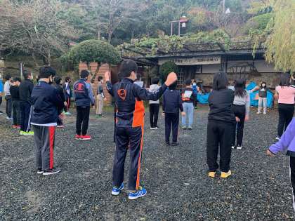朝の集いの様子です。宿泊先の敷地内にいろいろな施設があり、池の様子を観察したり、朝の体操をしたりしました。