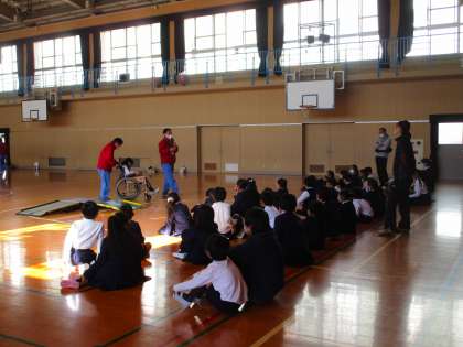 3時間目は、リハビリテーションセンターの方々が、車いすの基本的な操作説明をして下さり、その後、講堂内に設置したコースを自走体験しました。