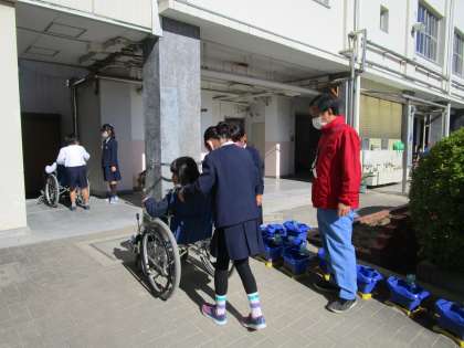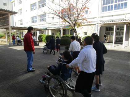 4時間目は、友だちを乗せての介助体験をしました。廊下やスロープ、運動場、段差のある所など、状況に応じて車いすの押し方の違いを学びました。