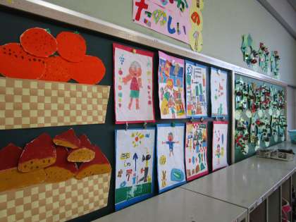 後ろの壁面には、図画工作科で制作したクリスマスリースと版画の作品が掲示されています。