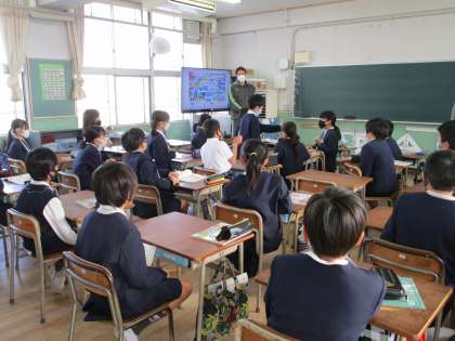 12月23日(水)、1時間目、5年生の教室では、外国語活動が行われていました。教室内を道路に見立て、担任の先生やALTの先生の指示に従って前進したり、左右に曲がったりする練習をしていました。とても楽しそうでした。