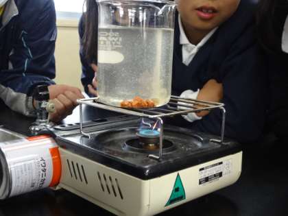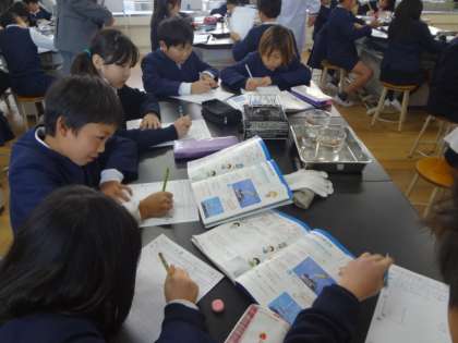 平野区の各小学校の先生方も参観する中、4年生で理科の研究授業が行われました。「あたたまった水はどのように動くのだろうか」というめあてをもち、予想を立て実験し結果を検証しました。水の動きを確かめるため、味噌や絵具、砂、サーモテープを使って実験しました。あたたまった水がどのように動くのかしっかりと目で確かめることができました。みんなの真剣に取り組む姿が大変印象的でした。今日の学びを今後の生活に役立ててほしいです。