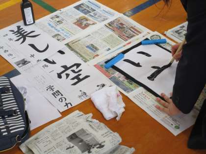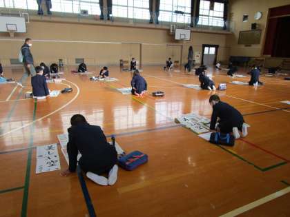 4年生は、2時間目、国語科の授業で書き初めをしました。教室では、狭く、密になるのでストーブをつけて広い講堂で行いました。普段、床に直接座って書く機会がないので、書きにくそうでしたが、児童は静かに集中して書いていました。