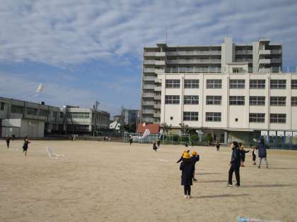 2月1日(月)、2時間目、1年生は運動場で凧あげをしていました。1月末に生活科の時間を使って2時間でしあげました。そこで、今日は2回目の凧あげ。風はあまりありませんでしたが、児童は走りながら一生懸命あげていました。