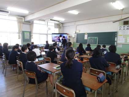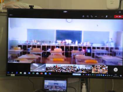 今日は、オンラインスマイル集会。今日のクイズは、カメラの前である物を投げ、一瞬映ったものが何かを当てる動体視力を見るクイズでした。児童は、ある物が画面に一瞬映る前には、静かに集中してテレビ画面に見入っていました。