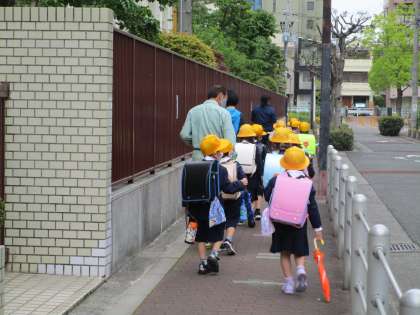 4月13日(火)、1年生は、午後2時ごろ集団下校をしました。これは、学校生活(下校)に慣れるまで、帰り道が同じ方向の児童が職員と一緒に家に帰るものです。児童は先生の指示に従って、きちんと並んで下校していました。