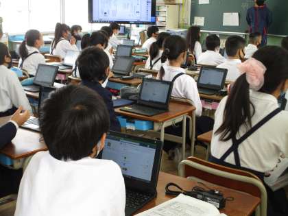 5月11日(火)、5年生の教室の横を通ると、朝の会の最中で、担任の先生が児童にいろいろな話をしているところでした。昨日、双方向通信の接続テストをしたところでしたが、この後、双方向通信で、できることについて担任の先生から説明を受けるため、児童は机にタブレットを用意していました。
