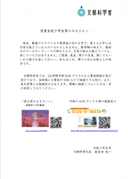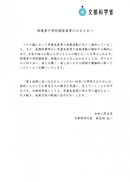 児童生徒等に向けた自殺予防に係る文部科学大臣からのメッセージです。
