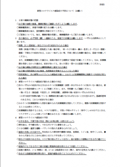 20日(木)21日(金)は、集団登校し、1〜4時間目授業、給食終了後、午後1時30分下校、午後は家庭学習(プリント・ICT活用)、もしくは学校で預かりとなります。