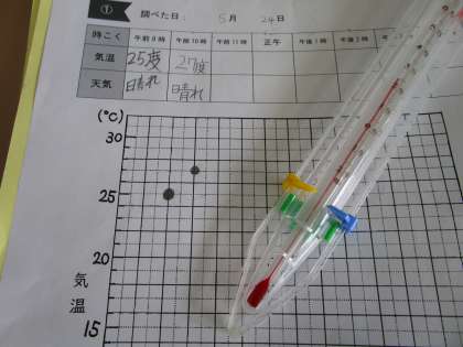 また、道徳の授業と並行して、理科の「気温の変化」の学習で1時間ごとの気温も班ごとに素早く測定していました。