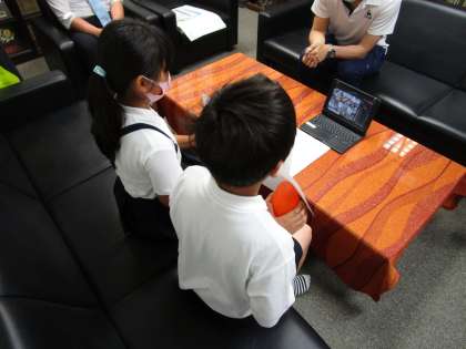 本日から、月曜日の児童朝会は、オンライン朝会になりました。校長室に校長先生をはじめ、今日の児童朝会担当の先生、計画委員会の児童が集合して、児童朝会が始まりました。
