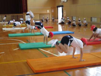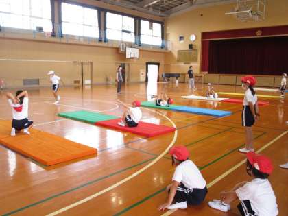 6月18日(金)2時間目、3年生は講堂で体育の授業でした。今日はマット運動で、基本の運動から前転等、順番にきちんと練習していました。基本の練習では、しっかり足をあげて上手に演技している児童がいました。