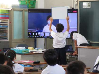 今日のスマイル集会は「何が通ったかゲーム」で画面の向こうで何が通過したかを当てるゲームでした。答えは「跳び縄」で、2年生の教室のグループは見事正解でした。