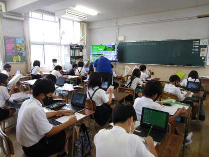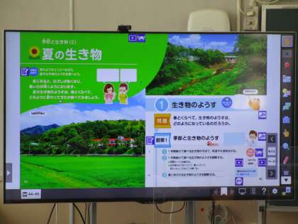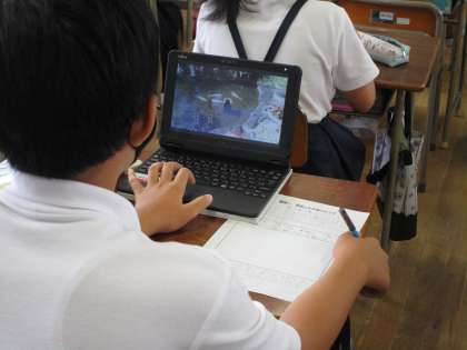 7月16日(金)1時間目、4年生は理科の授業でした。今日は「春のようすをくらべながら、夏の生き物のようすを調べよう」と題して、春に書いた観察カードと比べながら、夏の生き物について、夏の生き物の観察カードに記入していました。以前、タブレットで撮った写真を見ながら、カードに池の鯉やツツジの絵を描いている児童もいました。