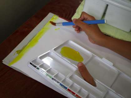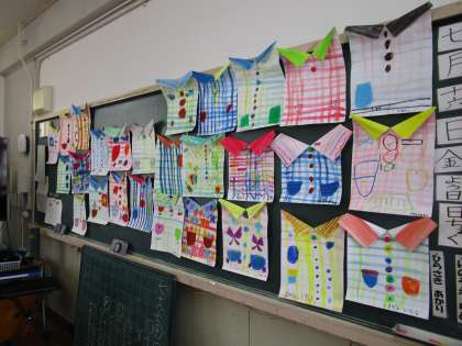 2年生は前回の図画工作科の授業で、初めて絵の具の使い方を学習しました。2色の色を交差して線を引く練習をしましたが、今回は、その練習で描いた画用紙を縦にし、裏向けて、上から少しだけ色を塗りました。乾いてから、上から少しだけ塗った部分の真ん中に切り込みを入れ、折り返すと・・・・・。なんと素敵なシャツができました!