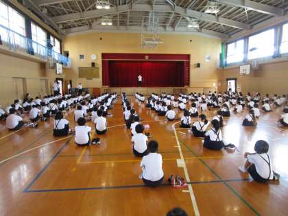 そして、終業式。校長先生が、毎月玄関掲示されている新聞から読書の大切さについての話をされました。その後、生活指導の先生から、夏休みのくらしについての話があり、夕方6時までには、必ず家に帰るように児童に確認しました。最後に、校歌を静かに聴きました。