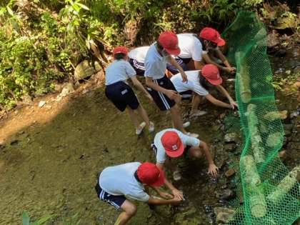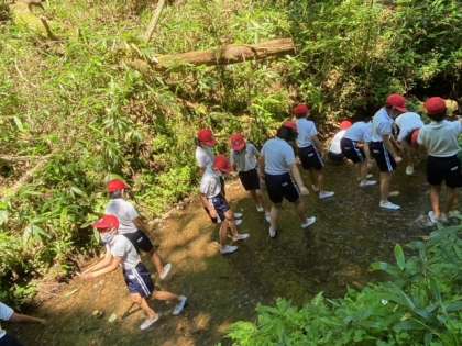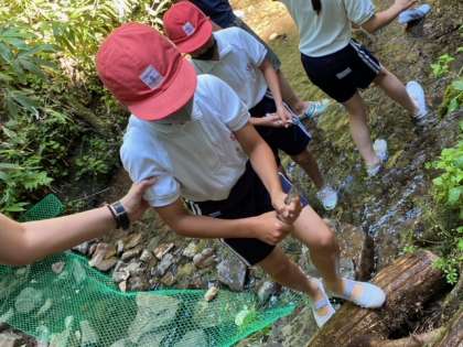 食事もとり、水着と体操服に着替えて魚つかみをしました。ヌルっとしてつかみにくかったですが、なんとか捕まえることができました。