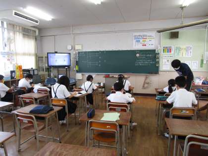 9月30日(木)1時間目、4年生は算数の授業でした。現在、4年生の算数は、習熟度別学習を実施しており、この日は、「のびのびコース」と「どんどんコース」に分かれて「倍の見方」の単元を学習していました。キャベツとレタスの値上がりの違いからどちらの方が値上がり方が大きいかを考えていました。教室の横の窓のところには、困った時にヒントになるカードが掲示されていました。