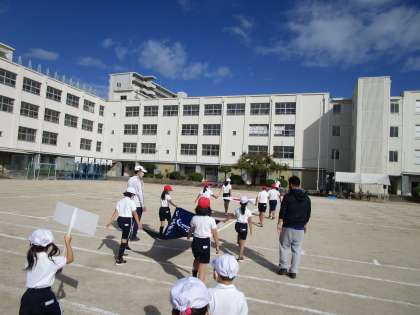 今日は、運動会全体練習の1回目。少し寒かったですが、朝から快晴で気持ちの良い日でした。礼の仕方、入場の仕方、回れ右の仕方等を一つ一つ確認し、入場から開会式、座席の確認をしました。その後、水分補給をしてから最後にみんなで石拾いをしました。児童はしっかりと話を聞き、1時間ですべての練習予定が終わりました。