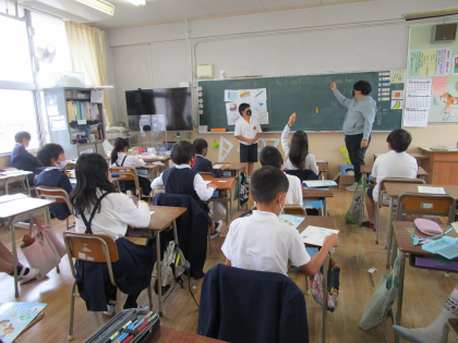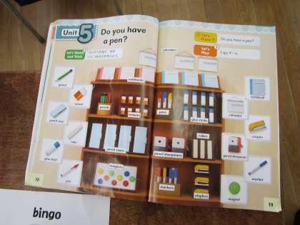 11月8日(金)4時間目、4年生は外国語学習で、Do you have a pen?の単元を学習していました。ICTの先生の質問に前に出ている児童が英語で答え、他の児童は、それに合わせてビンゴゲームをしていました。その後、英語で言いながら絵カードを出し合い、ポイントを競い合うゲームを楽しそうにしていました。