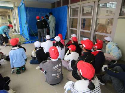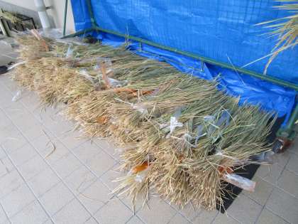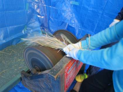 5年生は、いよいよ米の収穫! 昨日から講堂前に脱穀機を管理作業員さんが準備してくださり、本日2時間目から作業が始まりました。干してあった稲穂を全員で運び、一人ずつ順番に脱穀作業をしました。田植え・稲刈り・脱穀と、とても良い経験になりました。