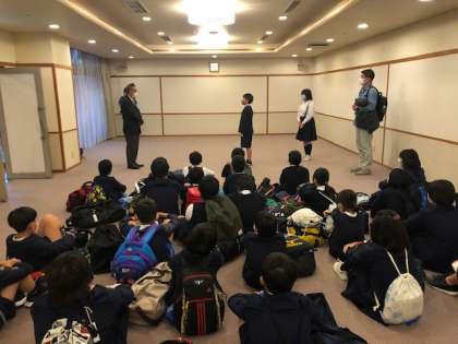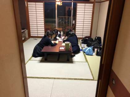 入所式の様子と、避難訓練を終えて夕食までの間、部屋でゆっくり過ごしている様子です。