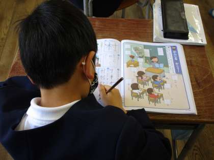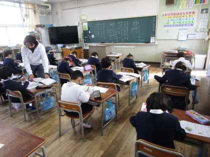 11月30日(火)1時間目、1年生は漢字の学習をしていました。今日は、「村」「町」の2文字を練習していました。ドリルにていねいに書いていました。