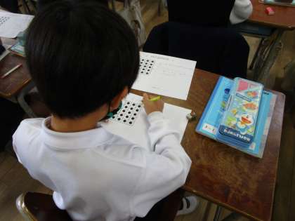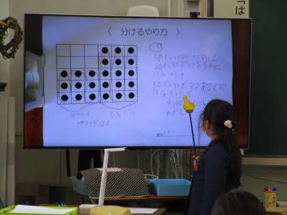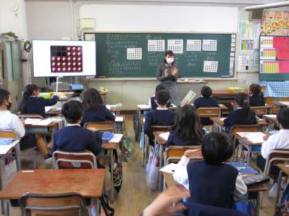 12月1日(水)2時間目、2年生の教室では、研究授業がありました。今日は、算数科の「九九をつくろう」の単元で、箱に入ったチョコレートの数をかけ算を使って工夫して求める勉強でした。児童は同じ数のまとまりに注目して、縦に分けたり、横に分けたり、全体からない数を引いたりしながら、自分なりに工夫して一生懸命問題に取り組んでいました。