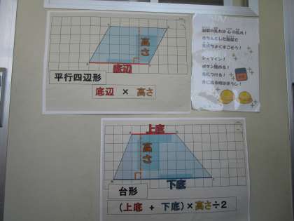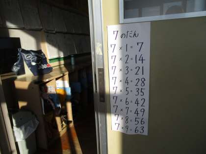 教室の扉に、授業で学習している内容の掲示物が掲示されている学年があります。児童は、教室に入る前にその掲示物を見てから入るようにしています。特に、2年生では、今、九九を覚えるために、声に出して言えてから教室に入っていました。