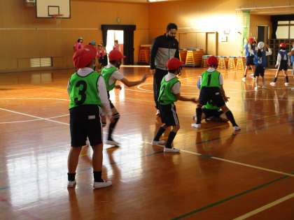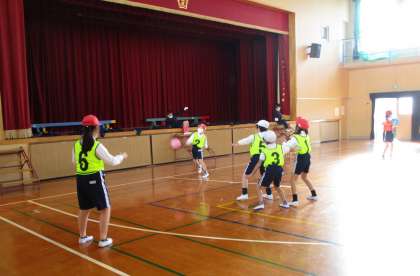 2時間目、3年生は講堂で体育の授業でした。5人1組になって2人と3人に分かれてのボールゲームをしていました。寒さに負けず、しっかりとボールを追って動いていました。