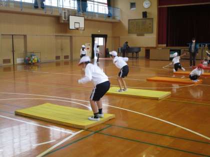 2月15日(火)2時間目、2年生は体育館でマット運動をしていました。前転と後転を上手にしていました。(写真1枚目)
