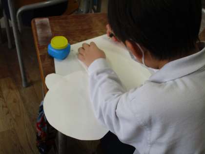 1年生は、教室で図工の授業でした。紙版画の制作で顔のパーツを作る作業をしており、画用紙をはさみで切っていました。(写真3枚目)