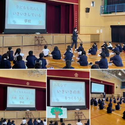 始業式では子どもたちと目標を共有しました。合言葉は「みんながつくる みんなの学校 長原小」この「みんな」は「自分」のこと。そして、どんな学校をめざすのか?それは「子どもも大人もいきいきしている学校」では、「いきいきとは?」言い換えると「笑顔で元気に楽しく」です!子どもたちからも同じような意見が出ました!