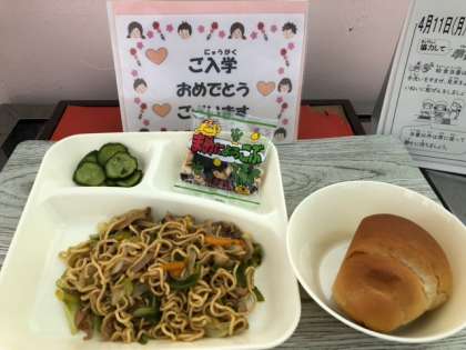 給食室の前には調理員さんから1年生にお祝いのメッセージが掲示されるとともに、今日の給食メニューが並んでいます!やきそば!きゅうりのしょうがづけ!豆こんぶ!です!とってもおいしくいただきました!