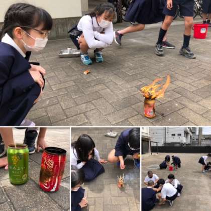理科の実験中でした!「ものの燃え方」についての学びです!穴のあいた缶とあいていない缶!その比較実験です!子どもたちはグループで協力して実験にチャレンジしていました!
