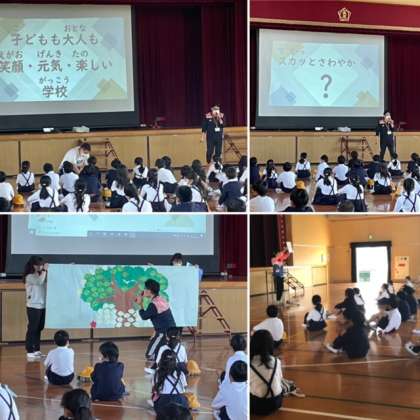 「スカッとさわやか!」と言えば、「コカコーラ!」これはさすがに子どもたちは???「元気100倍!」と言えば、「アンパンマン!」これはみんなで大合唱!じゃあ、長原小学校の合言葉は?