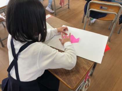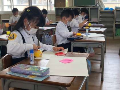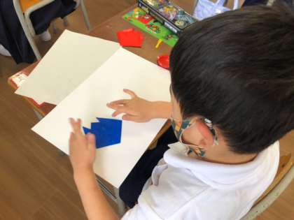 つぼのりからお兄さん指を使ってのりを取り出し、色紙にぬり、はりする作業にチャレンジする子どもたち!