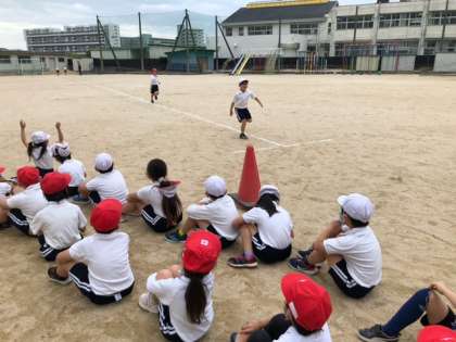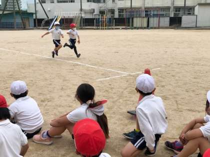 子どもたちがゴール目指して走ります!50m走へのチャレンジです!