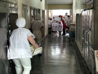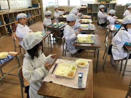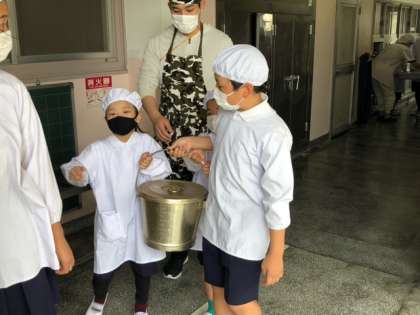 子どもたちは、リーダーの6年生の力をかりて、給食を自分たちで運んでいます!