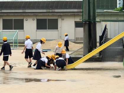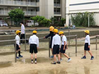 遠足が延期やむなしと思えるほど、運動場には水たまりがあちこちにできています。その水たまりを活用して、水の流れについて学習しました!まさに、ピンチはチャンスです!