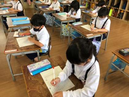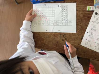 子どもたちはマス目の数を確かめながら、ひとつずつ解いていきます!指を使いながら確認する子ども、頭の中に数字を浮かべて考える子どもなど、答えの導き方は人それぞれです。