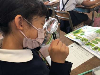 モンシロチョウのたまごの観察です!虫眼鏡でじっくり観ます!大きさ、色、形など真剣に眼鏡を覗き込む子どもたち!