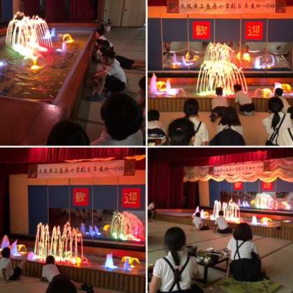 サプライズショー!旅館のサービスで子どもたちにステキな噴水ショーが披露されました!舞台が一瞬にして、噴水場に大変身!子どもたちも不思議の嵐!思わず前のめりで見入った子どもたちでした!お腹も心も豊かになって大満足でした!旅館のみなさん!ありがとうございました!