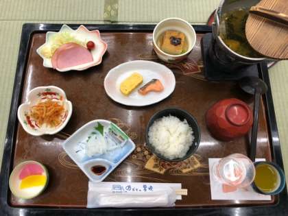 朝食もバランスよくいただきました!シャケ!卵焼き!ハム!きんぴら!揚げ豆腐!いかそうめん!と豊富なラインナップ!なかでも味噌汁があったかいのがよかったですね!ひと手間かける旅館のおもてなしに朝から感激です!