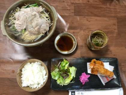 今日のランチメニューです!豚肉と野菜の鉄板焼き!エビフライに鳥の唐揚げ!そこに、お蕎麦がいいアクセントになってます!信楽の田園風景にはお蕎麦が似合います!大満足です!