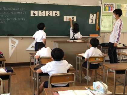 少人数に分かれて、学びを深める子どもたちです!4桁の数字を使って、足し算や引き算を考えます!自分たちで問題を考えるのがとても楽しそうでした!イキイキしていていいですね!