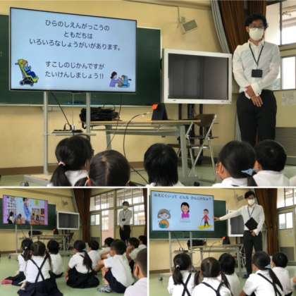 支援学校の概要や施設の写真などの説明から、子どもたちは身近な存在であることを知りました。さらに、目や耳、体に障がいのあるお友だちにとっての実体験を映像や音、体の動かし方などの手段を通じて知ることができました。そして、なかよくなるためには、相手のことを知ること、相手のことをより理解することの大切さを学びました。