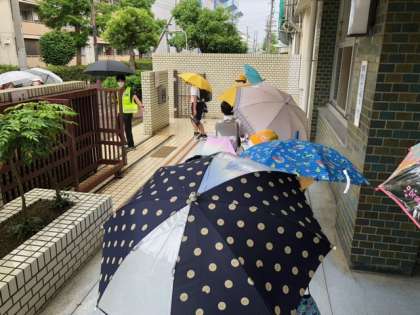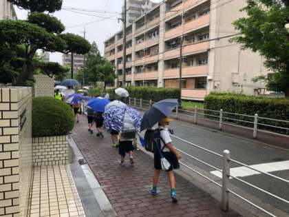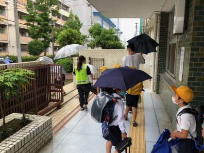 子どもたちは雨の中、みんなそろって学校を出ました!