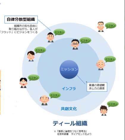 そこに集まった個人やパートナー企業が思い思いにそれぞれのビジョン(妄想)をミッションの価値観を守る範囲で実現していく、いわゆる「ティール組織」が望ましい。