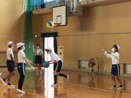 子どもたちはソフトバレーボールにチャレンジしています!ペアになってボールをパスしあいます!思った以上に難しそうです!それでも子どもたちは明るく!楽しく!元気いっぱい!活動しています!